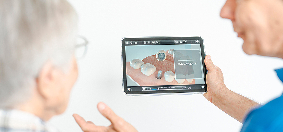 Sie haben einen oder mehrere Zähne verloren, die ersetzt werden müssen? Dann können wir mit Implantaten einen vollwertigen Ersatz schaffen und Ihnen ein Gefühl von Sicherheit und Vollständigkeit zurückgeben. Denn beim Implantat wird nicht wie bei einer Brücke oder Prothese nur der Teil ersetzt, der aus dem Zahnfleisch herausschaut, sondern auch die Zahnwurzel. Dazu setzen wir eine Art Schraube in Ihren Knochen ein, die fest mit dem Knochen verwächst. Sofort oder einige Monate später erhalten Sie dann eine ästhetische und auf Wunsch auch komplett festsitzende Versorgung. Anders als bei anderen Zahnersatzversorgungsformen können wir so Ihre eigenen gesunden Zähne schützen und erhalten. Auch Patienten mit bisher herausnehmbarem Zahnersatz können dadurch mehr Sicherheit, Komfort und Lebensqualität erhalten.